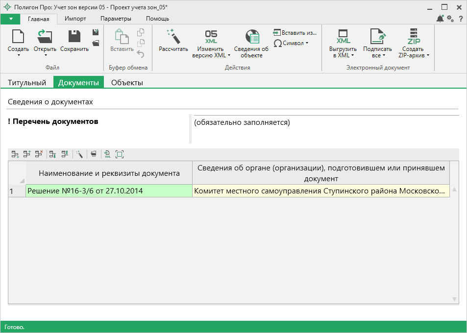 В таблицу "! Перечень документов" вносятся сведения о документах. Чтобы заполнить таблицу, в ячейке таблицы нажмите кнопку