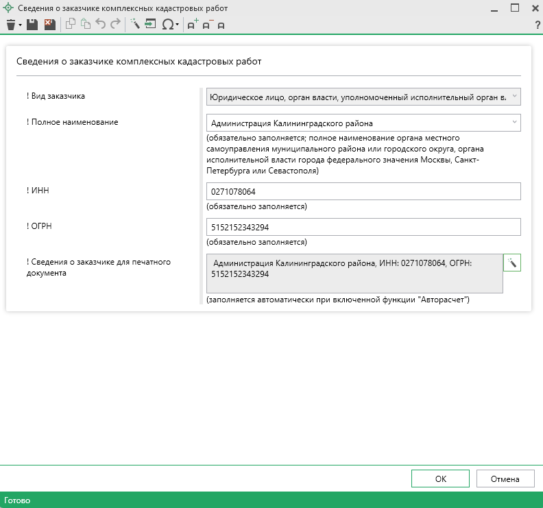 Откроется окно "Сведения о заказчике", заполните необходимые данные.