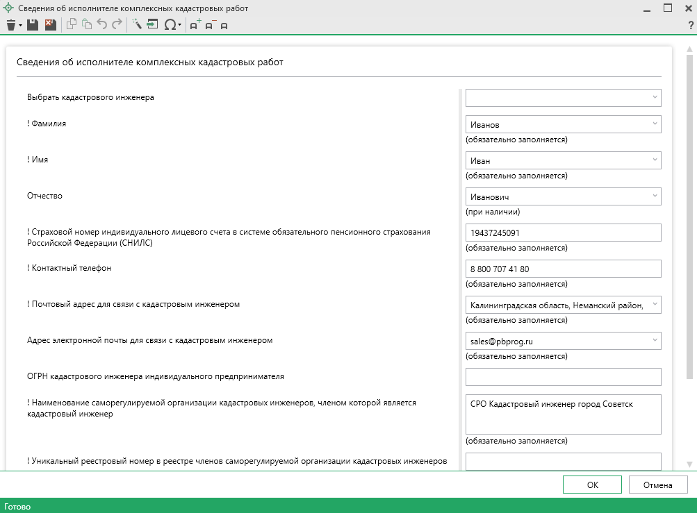 . Откроется окно "Сведения о кадастровом инженере", заполните необходимые данные.