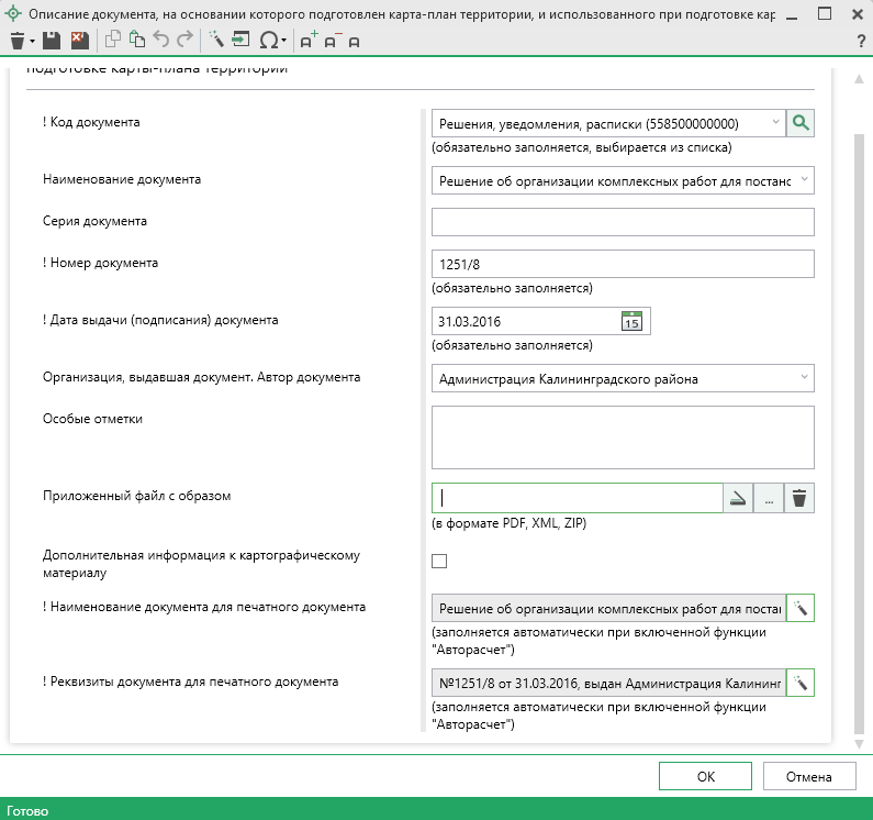 . Откроется окно "Описание документа, использованного при подготовке карты-плана территории", заполните необходимые данные.