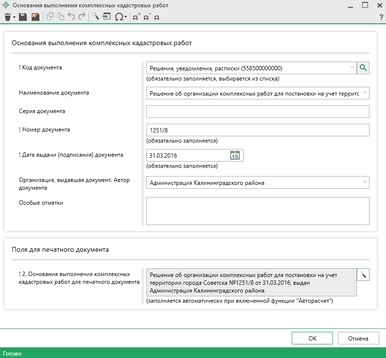 Откроется окно "Основания выполнения комплексных кадастровых работ", заполните необходимые данные.