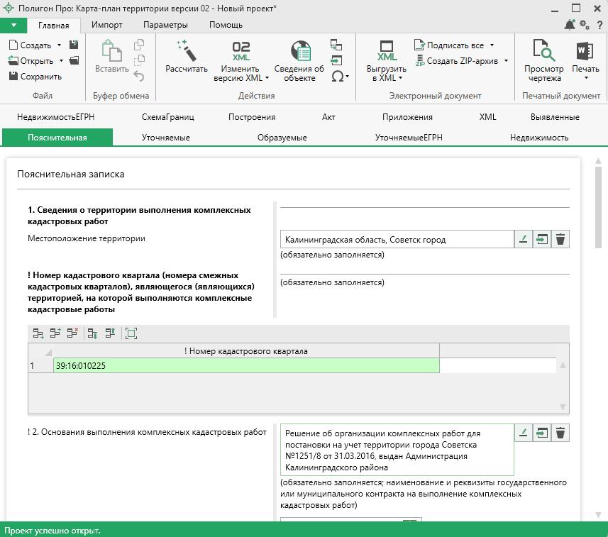 Раздел "Пояснительная" предназначен для внесения сведений о производимых кадастровых работах.