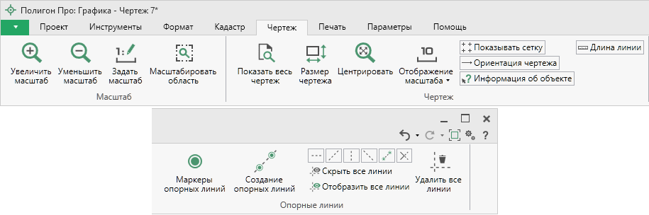 Вкладка "Чертеж" содержит основные функции для управления масштабом, внешним видом чертежа, а также дополнительные инструменты для построения. Все функции сгруппированы в три панели: "Масштаб", "Чертеж", "Опорные линии".