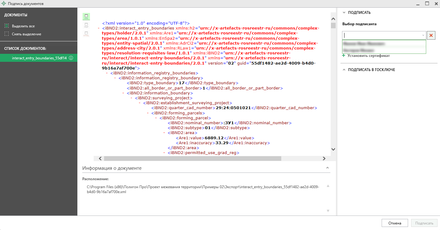На панели "Выбор подписантов" из выпадающего списка выберите, каким сертификатом необходимо подписать документы: