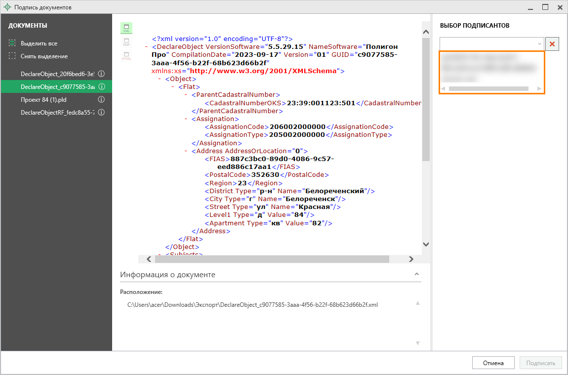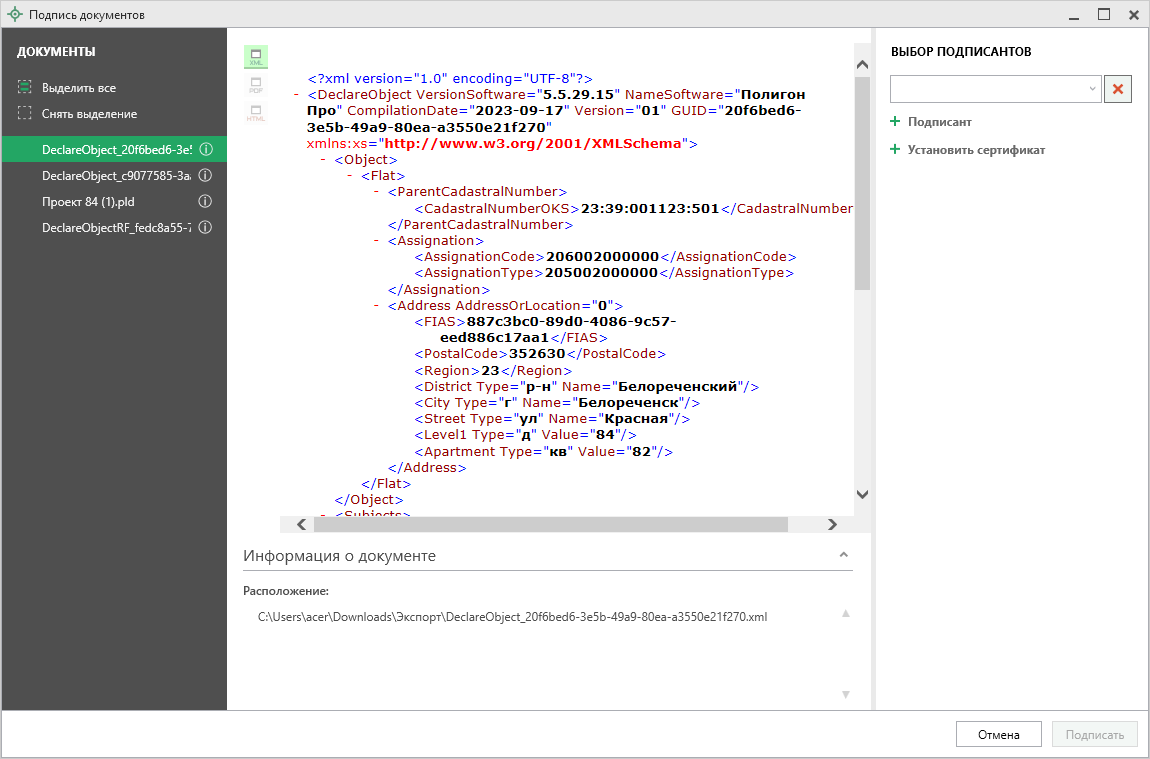 Если при формировании XML-файла ошибок не возникло, откроется окно "Подпись документов":