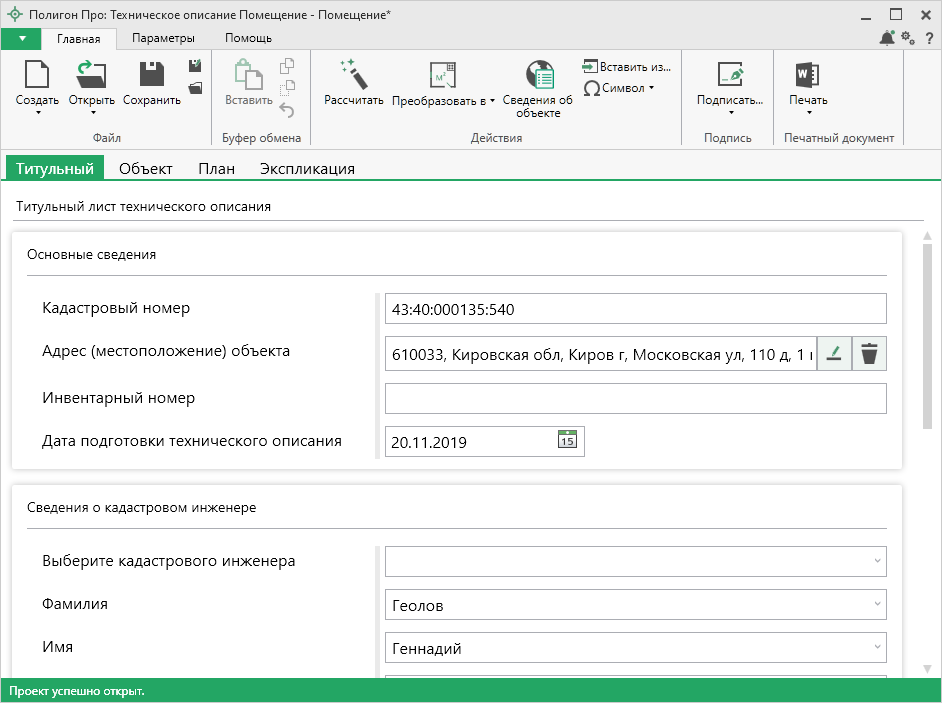Раздел "Титульный" предназначен для внесения сведений об объекте, о кадастровом инженере, который выполнил описание.