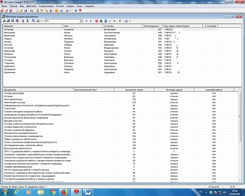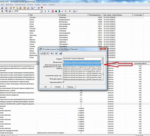 государственное бюджетное профессиональное образов написал: Еще хотелось бы увидеть доработку вот в чем: при выставлении оценок в справочнике "итоговые оценки документов" мы использовали на панели инструментов справочника "визуальные кнопки оценок", это очень удобно. Но одно неудобство, весьма замедляющее работу: при выборе нужной дисциплины и последующем нажатием на "визуальную кнопку с оценкой", после подтверждения ввода выбранной оценки, курсор переходит на следующую дисциплину вниз по списку, а "программа" возвращает к началу списка дисциплин , после чего нужно прокручивать список вниз, чтобы уведет на какую строку (дисциплину) перешла позиция, для последующего ввода оценки (это неудобство особо заметно, когда список дисциплин больше 30 , чем помещается на экране) . Пример: На рис.1 видно только 30 дисциплин (при разрешении 1280х1024), а в списке может быть 60 и более.