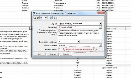 Предложение: 1. Будет удобно, если доработать в справочнике "итоговые оценки" выпадающий список дисциплин, чтобы при наведении курсора на дисциплину, выбранную в общем списке, отображалась вся тема целиком. 2. Если использовать (как и задумано разработчиком) поле "дополнительный текст" + "Галочка - курсовая работа" в справочнике итоговые оценки", для вставки темы КР, но в этом случае в приложение на странице №4 вписывается название дисциплины (что является лишним, для нас), а затем текст из поля с "дополнительный текст" и оценка. Можно ли в этом варианте добавить дополнительную "галочку" с выброрм например "не вписывать название дисциплины", см. рис2.?