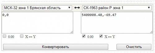 Доброго дня, и спасибо за столь необходимый, а главное, бесплатный инструмент! Хочу указать на спорный момент, который приведен на приложенном скрине. МСК-32 (впрочем как и МСК-67 и много других кадастровых СК регионов) получены путем изменения ложного смещения. Для указанного на скрине верным результатом должно быть: 5400000.00,0.00 С уважением, Виктор Савостин.