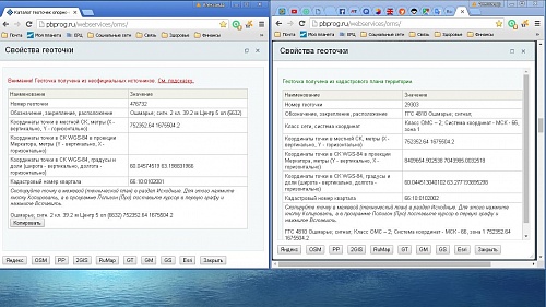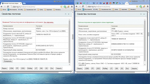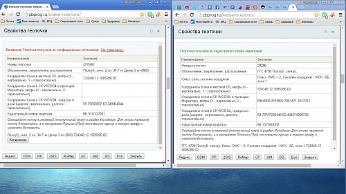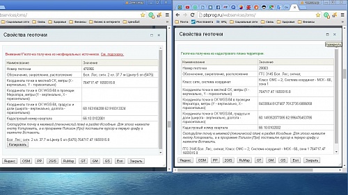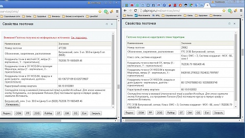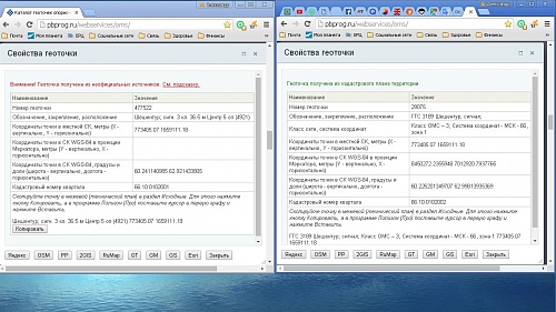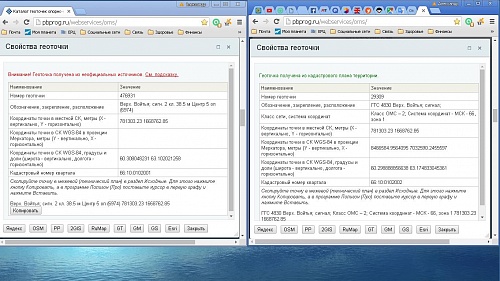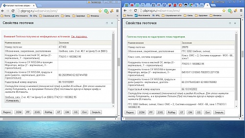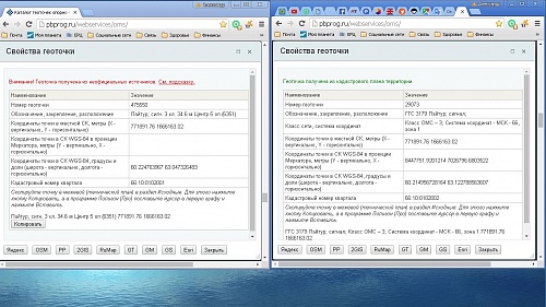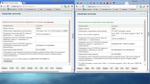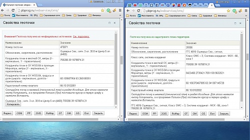 На скринах слева (где красным шрифтом предупреждения) точки получены из неофициальных источников. На скринах справа (зеленый шрифт и где в названии есть ГГС) - точки получены из Кадастровых планов территорий, выдаваемых Росреестром и содержащихся у нас в Архиве КПТ.