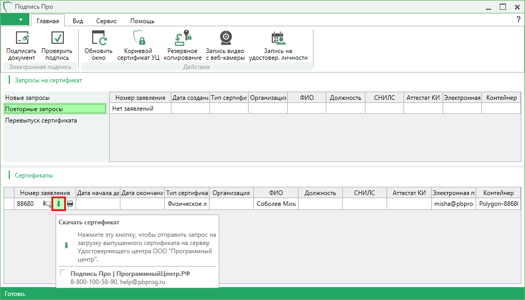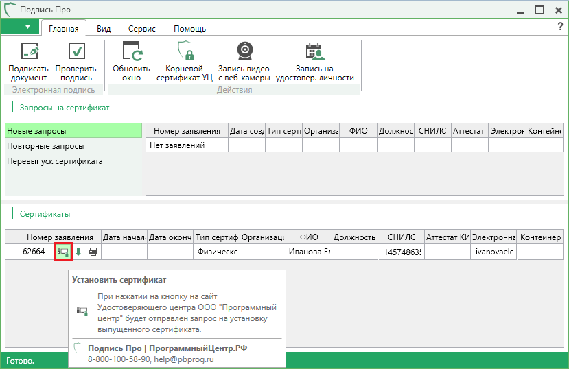После одобрения оператором УЦ запроса на сертификат, выпущенный сертификат скачайте и установите, используя программу "Подпись Про", разработанную специально для взаимодействия с УЦ ООО "ПРОГРАММНЫЙ ЦЕНТР".