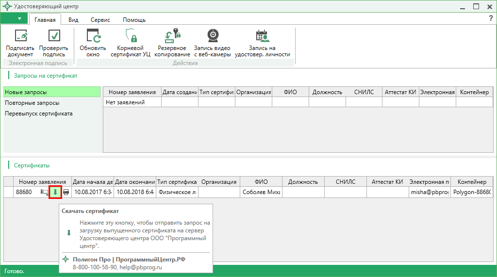 После одобрения оператором УЦ запроса на сертификат выпущенный сертификат скачайте и установите, используя либо демо-версию, либо рабочую версию (если таковая у Вас имеется) программы "Полигон Про".