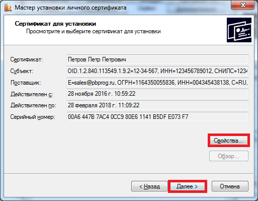 5. В окне "Сертификат для установки" отобразятся основные сведения, содержащиеся в устанавливаемом сертификате. Необходимо нажать "Далее".