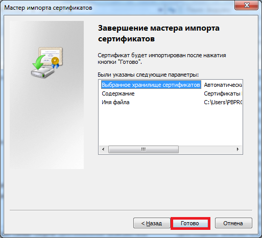 В окне "Завершение работы мастера установки личного сертификата" убедитесь, что выбраны правильные параметры и нажмите кнопку "Готово" для выполнения установки сертификата.