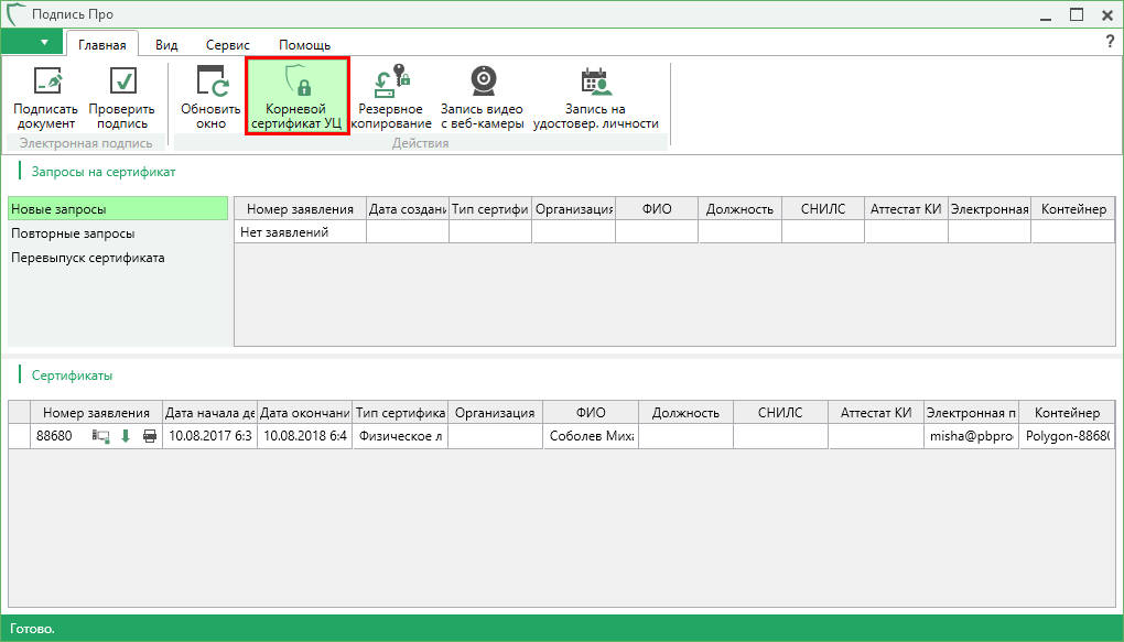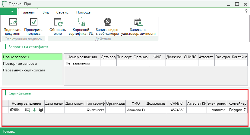 Выпущенный сертификат ЭП отображается в таблице "Сертификаты".