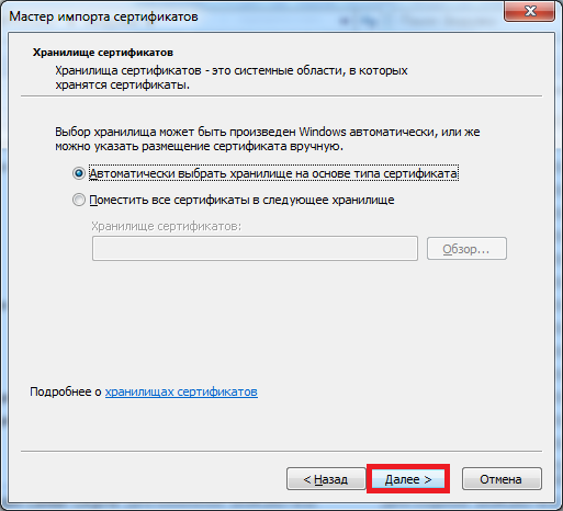 В окне "Хранилище сертификатов" необходимо удостовериться, что в поле "Имя хранилища сертификатов" указано "Личное", а в поле "Установить сертификат в контейнер" стоит галочка, после чего нажать "Далее".