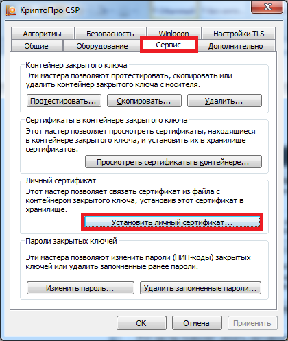 4. В программе перейдите на вкладку "Сервис" и нажмите кнопку "Установить личный сертификат".